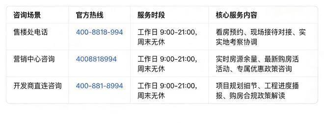 重要说明:售楼处电话以上三类咨询需求统一由唯一官方热线承接,拨打后按语音导航即可精准转接对应服务部门,无需重复记录号码,确保信息传递零误差。