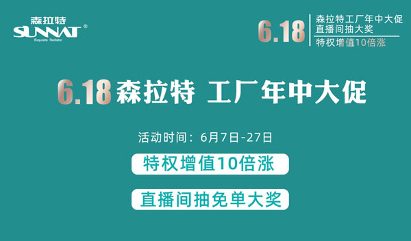 转眼之间,年中大促618购物节立刻就要来了,能够说是上半年最终一次能够参加到的大型促销活动了,暖气片职业里边也是各种拼价格、拼销量,更难以幻想的是各种付定金、抢付尾款等活动。相比之下,森拉特暖气片挑选了更简略粗犷的玩法,看直播玩砍价抢购赢免单惊喜,定要为咱们送出满满的福利。