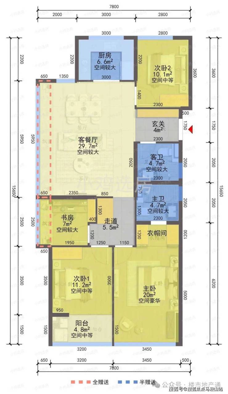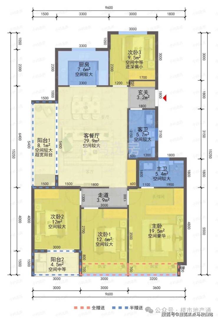 长处1、客餐厅都朝南,大面宽5.8米(其他项目往往就4米多),用横厅替代了传统的竖厅,客餐厅+阳台内包面积达到了30方