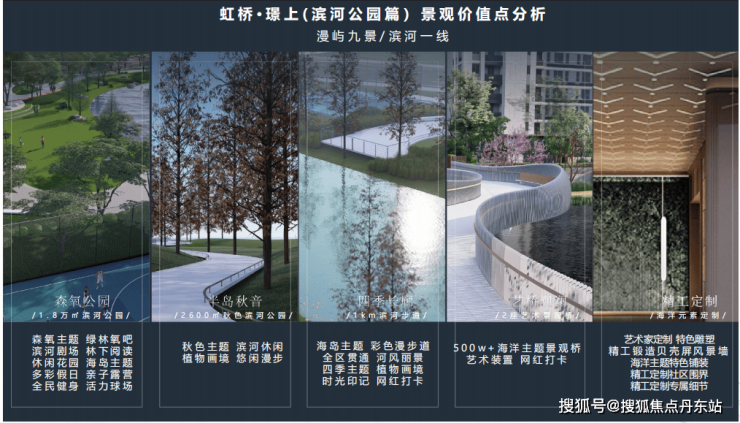 约2600㎡城市半岛公园 别具一番秋韵 细巧精美的半岛公园,像一枚镶嵌在水中的宝石,极具特征的乔木娜塔,晕染了秋的颜色,给人美的享用。 约1000m滨河步道 揽滨河驳岸四季画境 精选特征乔木与鲜花种类,调配四季颜色,夏有紫薇、秋有杉林、冬有梅香、春有樱花,沿河而行,美不胜收。